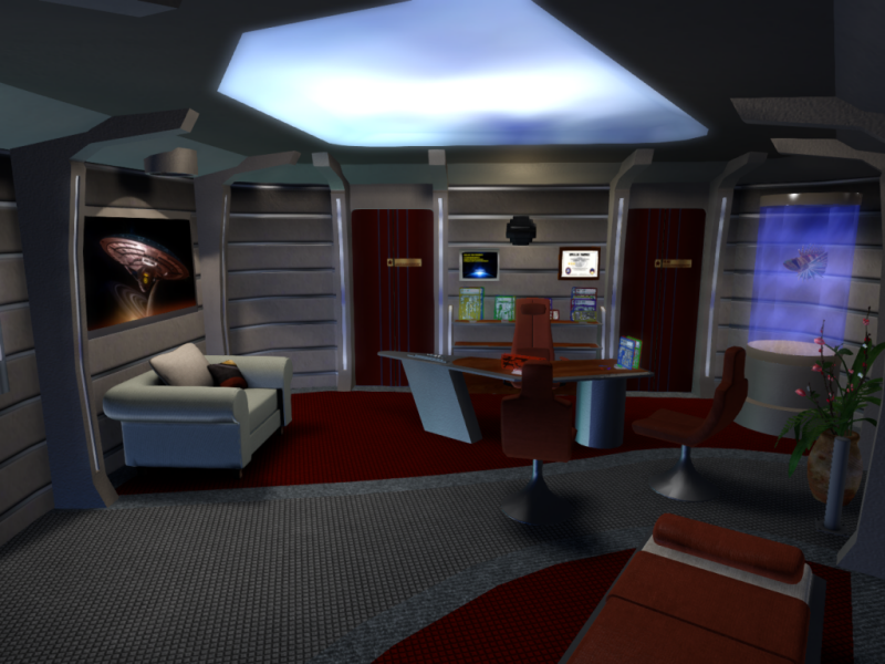 Here, the captain can engage in administrative work with all relevant office equipment at hand without interfering with bridge operations. In addition, this room is usually the preferred place where the captain can hold private discussions and/or receive classified communications. The ready room is equipped with a replicator, head, fold-out couch, desk (complete with LCARS terminal), and bookshelf.